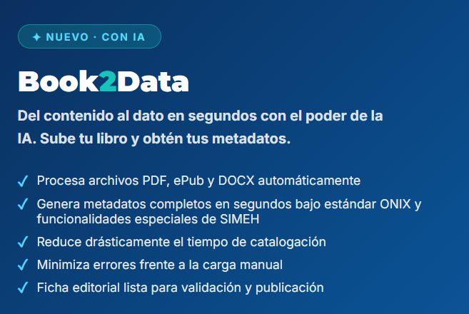 Para las editoriales que trabajan con SIMEH Premium, Book2Data representa una evolución natural: el paso de gestionar libros a gestionar conocimiento estructurado. Este cambio implica mejorar la capacidad de distribución, reforzar la calidad del dato editorial y abrir nuevas vías de explotación documental y analítica.